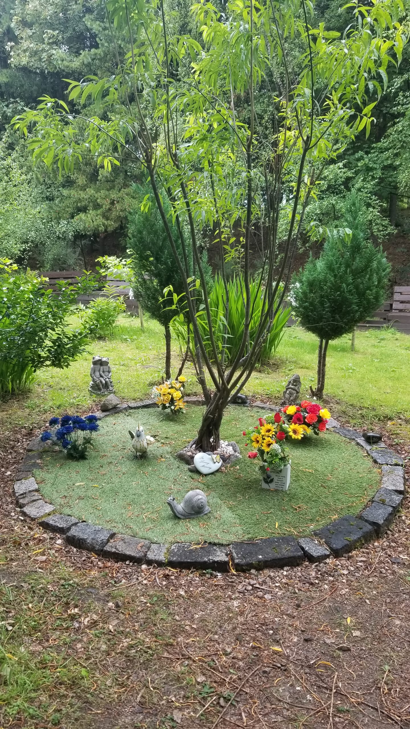 As we walked along the trail, we discovered areas where small features or scenes had been created and installed. Like the one in the picture below, with a giant snail, a loving couple of frogs, colourful flowers set within a stone circle.